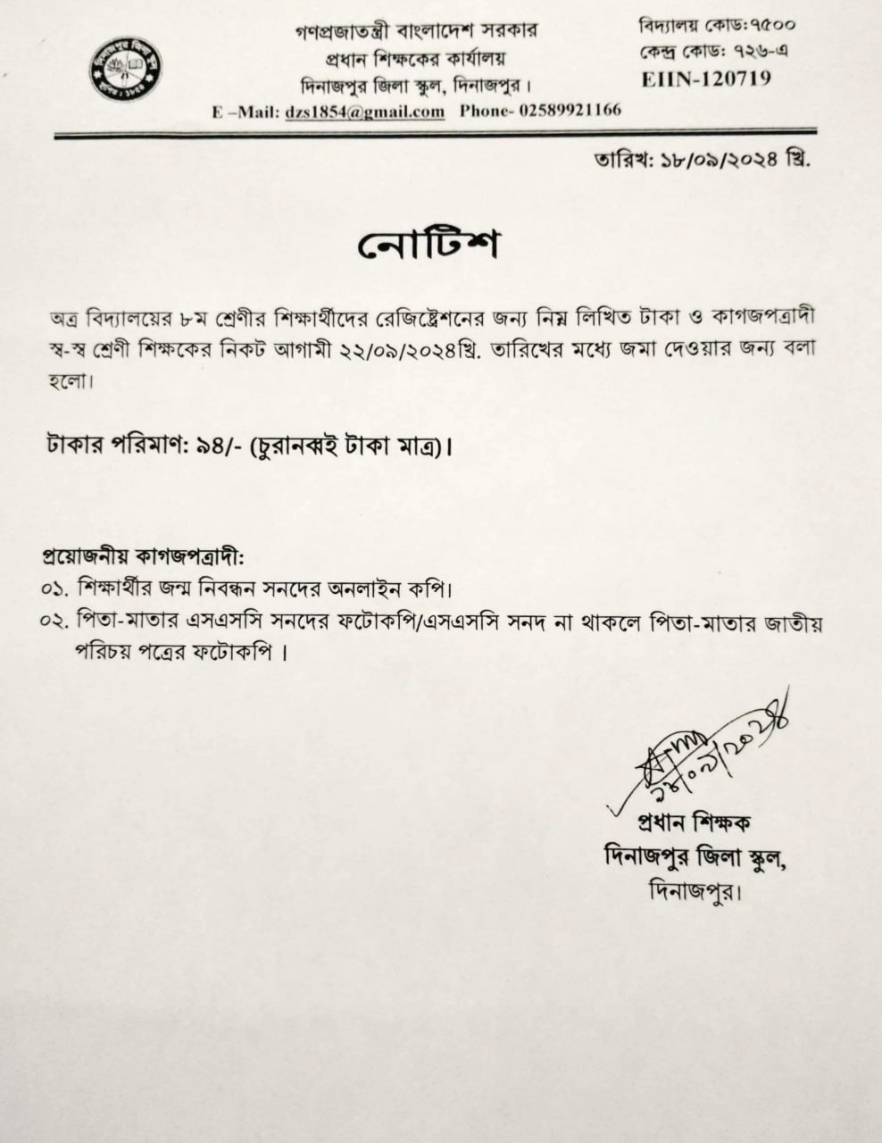 শিক্ষার্থীদের রেজিস্ট্রেশনের টাকা ও কাগজপত্রাদী জমা দান প্রসঙ্গে।